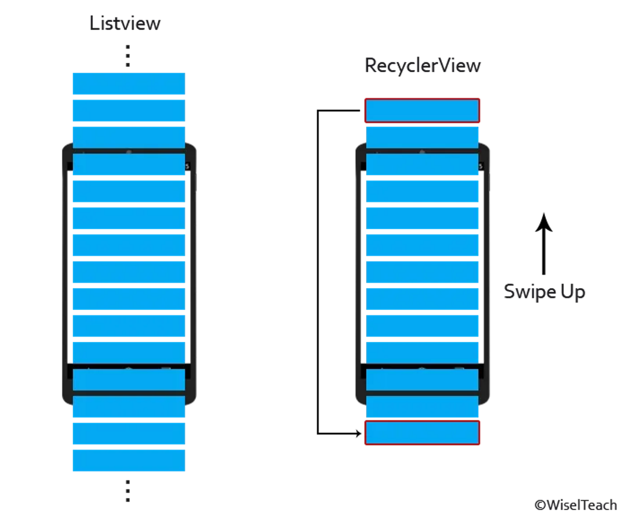 왜냐하면 기존의 ListView나 GridView는 밑으로 스크롤 할 때마다 위에 있던 아이템은 삭제되고, 맨 아래의 아이템은 생성 되길 반복하기 때문이다. 한 마디로 비효율적으로 일을 하는 형태이다.