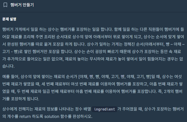 위 문제는 배열의 숫자를 스택에 넣어서 스택 안에 1,2,3,1 형태로 완전한 버거형태가 들어오면 카운트해주고 스택에서 하나씩 제거해주면 해결된다.