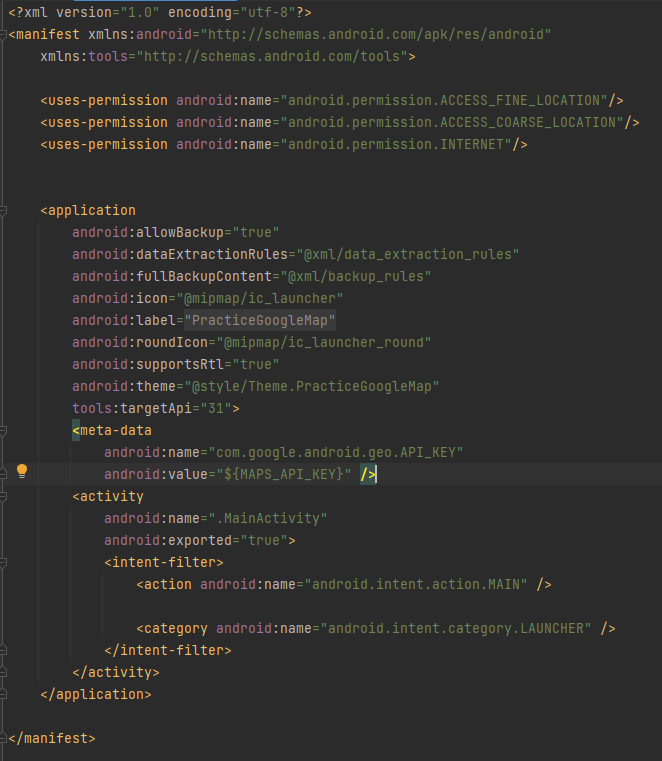 AndroidManifest.xml 파일에서 com.google.android.geo.API_KEY로 이동한 후 android:value attribute를 다음과 같이 업데이트합니다.