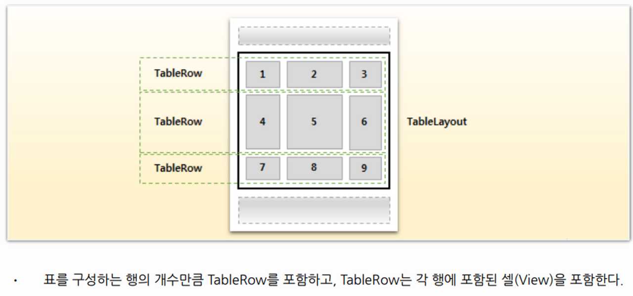 - 자식(Children) View위젯들을 테이블(행과 열로 구성)로 나누어 표시하는 Layout클래스