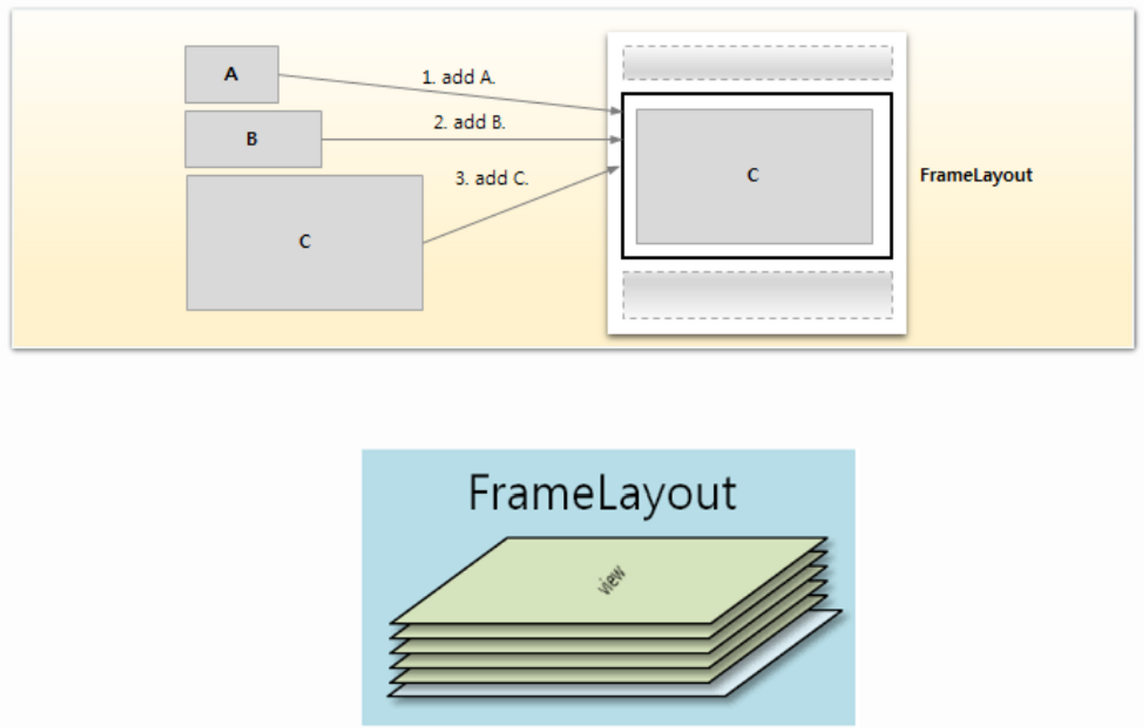 - FrameLayout에 여러 View위젯을 자식으로 추가하면 겹쳐진 형태로 표시되며,가장 최근에 추가된 View위젯이 가장 상위(ontop)에 표시