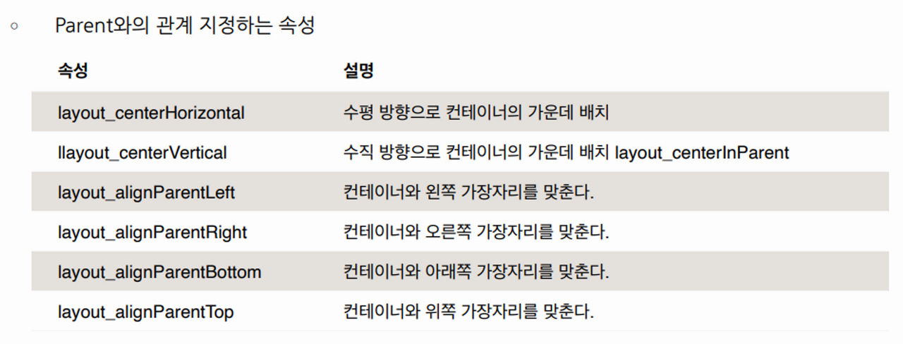 - View위젯들을 포함하는 Relative Layout(View위젯 입장에서는 부모(Parent))자체가 상대적 위치의 기준점으로 사용될수도있습니다.