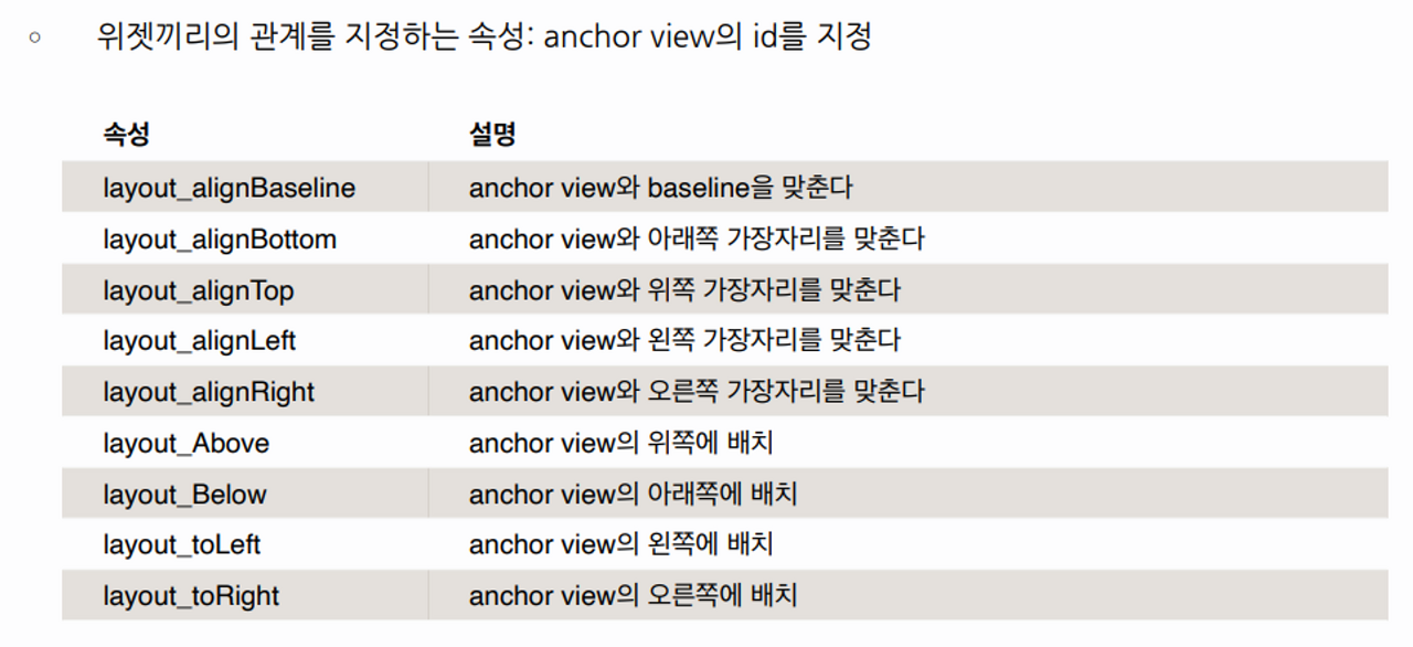 - RelativeLayout은 자식(Children)View위젯들이 서로 간의 상대적 배치 관계에 따라 화면에 표시 될 위치가 결정되도록 만들어주는Layout클래스