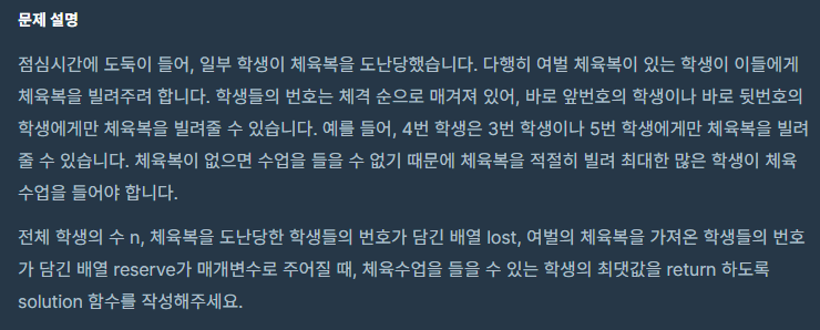 우선 체육복 여분을 가져온 학생이 도난을 당한 경우를 제하고 도난 당한 학생 배열을 정렬해준 뒤 도난 당한 학생의 값보다 작은 여분 가져온 학생 배열을 우선적으로 찾아주는 방식으로 했다. 시간은 20ms 안쪽으로 나왔다.