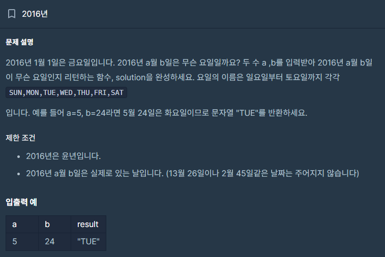 for 문으로 1월부터 a월 전까지 반복을 돌리고 when 문으로 각 월의 요일 수를 더해줬다. totalDay에 이미 b 값이 들어가 있기에 또 더해줄 필요는 없게 했다.